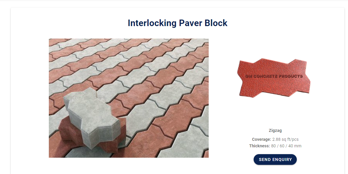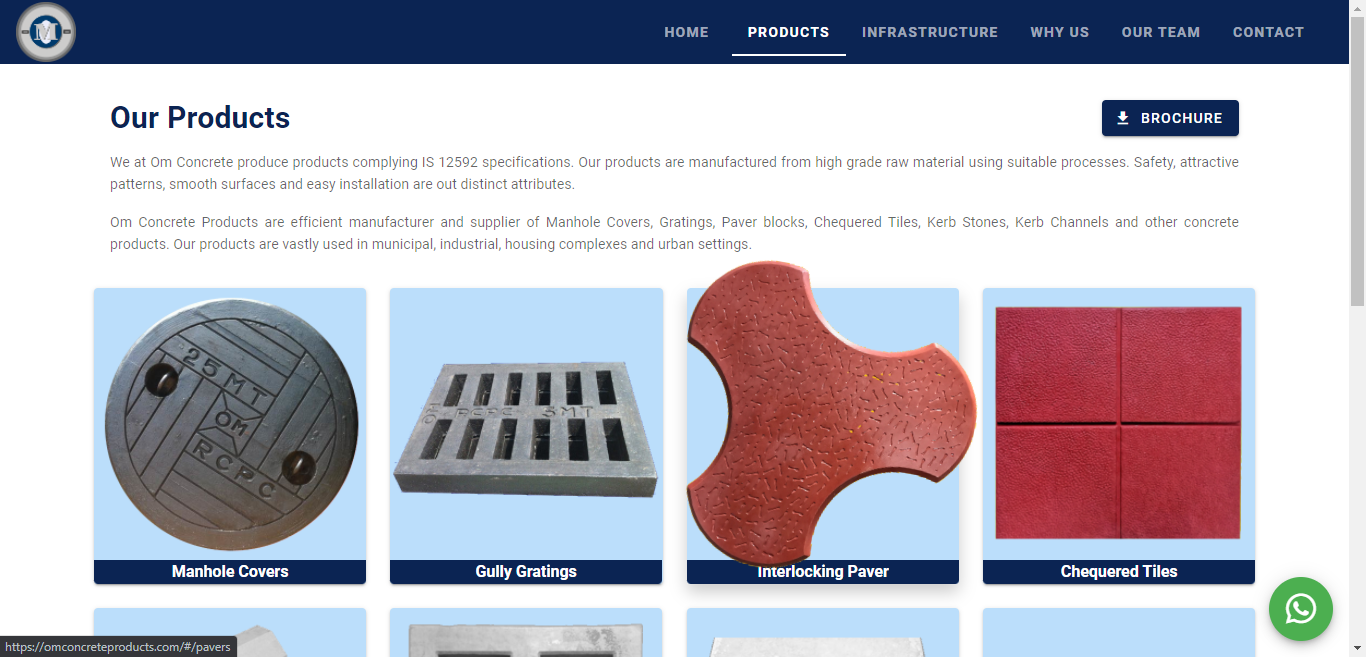Omconcrete Products are an are efficient manufacturer and supplier of Manhole Covers, Gratings, Paver blocks, Chequered Tiles, Kerb Stones, Kerb Channels and other concrete products. The products finds vast application in standard municipal, industrial, housing complexes and urban settings. The website is designed to advertise the products with their details and send queries regarding them.